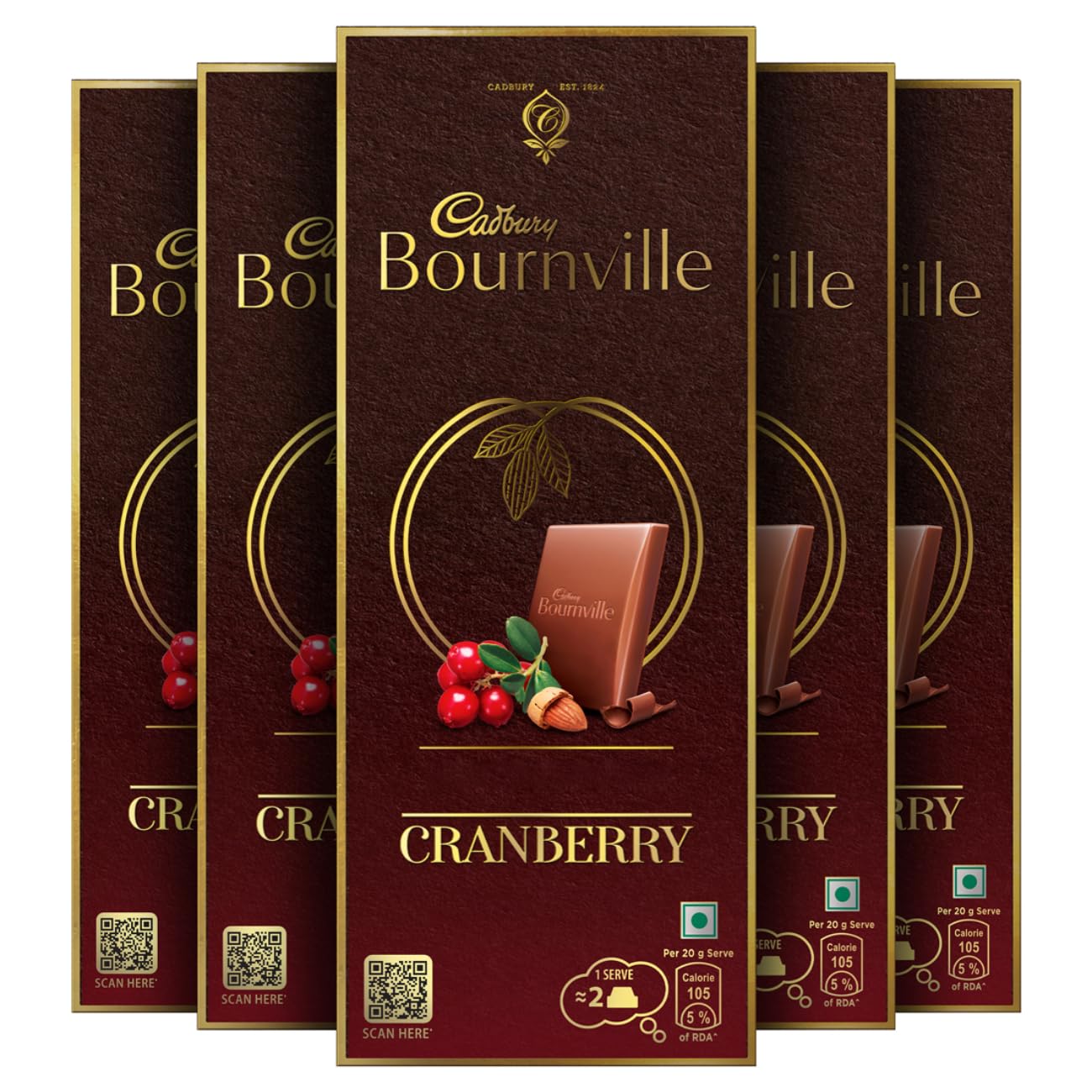- This pack contains 5 bars of Cadbury Bournville Cranberry Dark Chocolate Bar, 80 g & is delivered with a cool gel pack