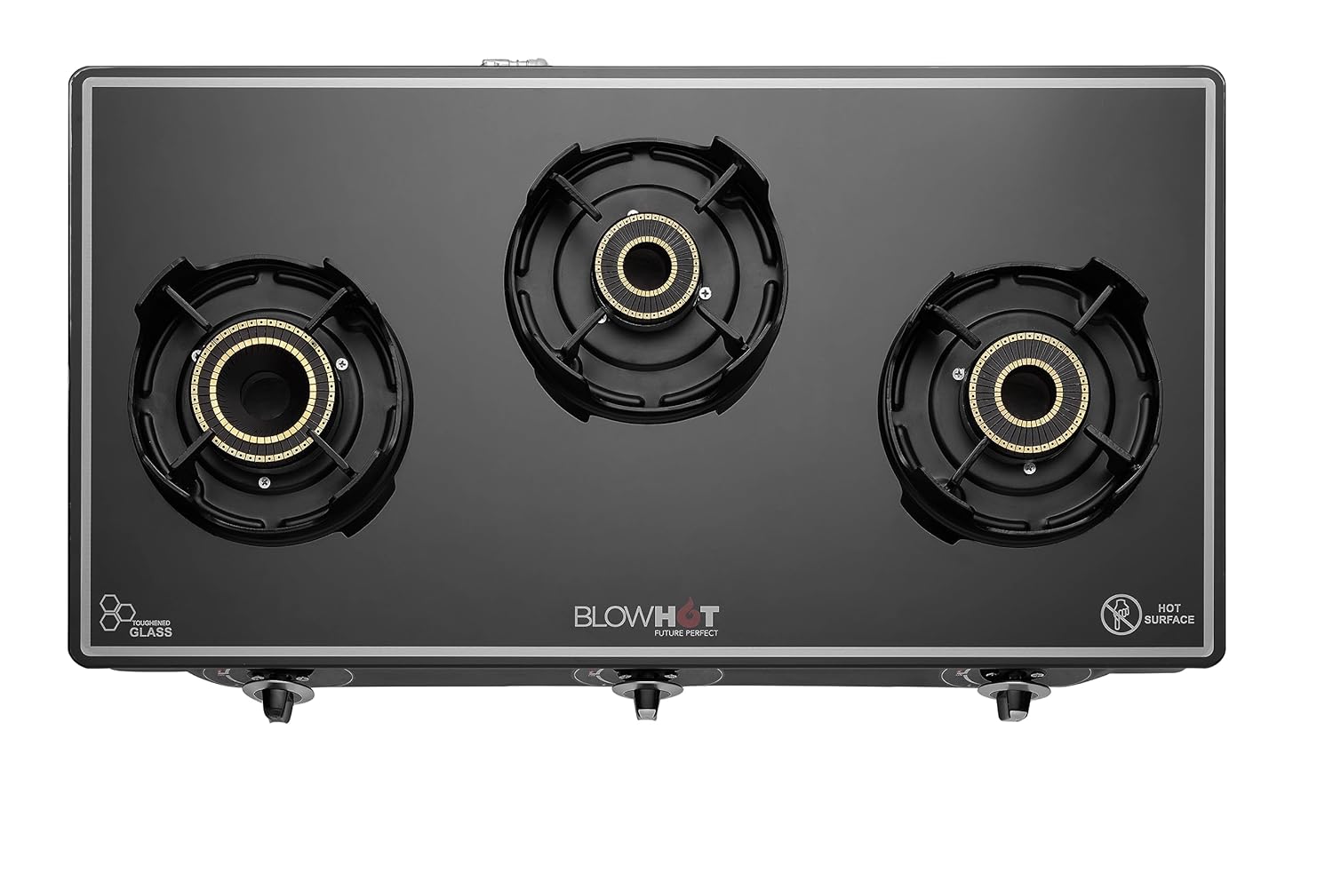 BLOWHOT Premium Design Emerald Heavy Tornado Brass 3 Burner Auto Ignition Gas Stove - Toughened Glass Cook Top - Black Coated Body 2 Year Warranty on Burner,ISI certified Gas stove Valve Glass