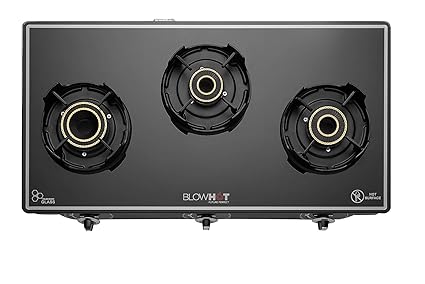BLOWHOT Premium Design Emerald Heavy Tornado Brass 3 Burner Auto Ignition Gas Stove - Toughened Glass Cook Top - Black Coated Body 2 Year Warranty on Burner,ISI certified Gas stove Valve Glass